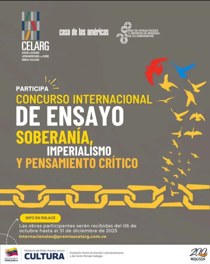 El Ministerio del Poder Popular para la Cultura de Venezuela, en colaboración con Casa de Las Américas (Cuba) y la Red de Intelectuales, Artistas y Movimientos Sociales en Defensa de la Humanidad, se complace en anunciar el Concurso Internacional de Ensayo Soberanía, Imperialismo y Pensamiento Crítico.