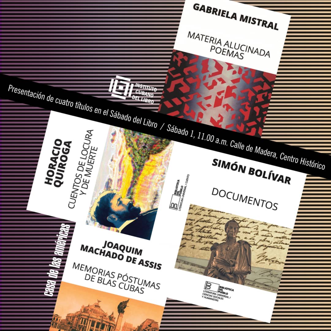 El tradicional espacio Sábado del Libro, que convoca el Instituto Cubano del Libro, presentará este 1 de noviembre a las 11:00 a.m. cuatro títulos de la colección Biblioteca del Pueblo, publicados por la Editorial Casa de las Américas: Documentos, de Simón Bolivar; Memorias póstumas de Blas Cubas, de Joaquim Machado de Assís; Cuentos de locura y muerte, de Horacio Quiroga y Materia Alucinada. Poemas, de Gabriela Mistral. La cita es en la Calle de Madera del Centro Histórico habanero.