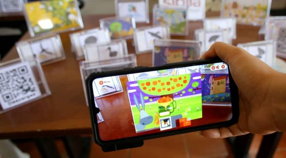 En esta feria que recién acabó estaban de muestra, porque la realidad aumentada lleva una aplicación de teléfono y un soporte, o sea una postal (o un marcador) donde uno levanta la imagen y la animación, que la hacen ellos mismos. La animación a través de las propias ilustraciones del libro que, como están divididas por capas ellos las animan: las mueven, le incorporan el audio a esa animación, y es una experiencia muy gratificante.