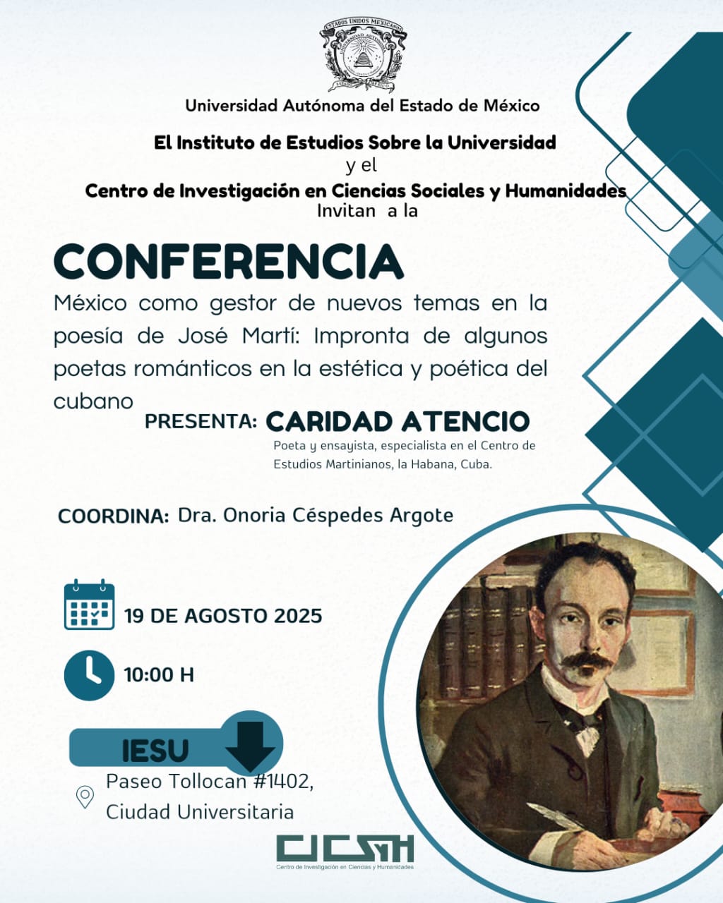 El martes 19 de agosto el Instituto de Estudios sobre la Universidad en México y el Centro de Investigación en Ciencias Sociales y Humanidades acogerá la conferencia «México como gestor de nuevos temas en la poesía de José Martí: impronta de algunos poetas románticos en la estética y poética del cubano», presentada por Caridad Atencio, poeta, ensayista y especialista en el estudio de la obra martiana del Centro de Estudios Martianos.