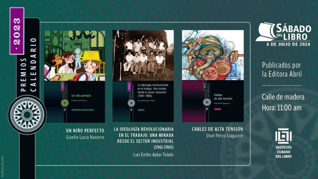 El tradicional espacio Sábado del Libro que organiza el Instituto Cubano del Libro presentará, este 6 de julio, los Premios Calendario 2023 que otorga la AHS (Asociación de Hermanos Saíz) publicados por la Editorial Abril: Cables de alta tensión, de Onel Pérez Izaguirre; La ideología revolucionaria en el trabajo. Una mirada desde el sector industrial (1961-1965), de Luis Emilio Aybar Toledo y Un niño perfecto, de Giselle Lucía Navarro.